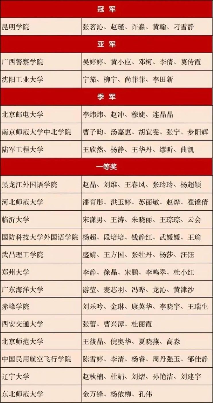 最终,昆明学院张茗沁、赵瑾老师代表团队荣获全国总决赛冠军;广西警察学院吴婷婷、黄小应老师和沈阳工业大学宁笳、柳宁老师代表团队获得亚军;北京邮电大学李炜炜、赵冲老师,南京师范大学中北学院曹子昀、汤嘉惠老师,陆军工程大学王欣然、杨静老师代表团队获得季军。