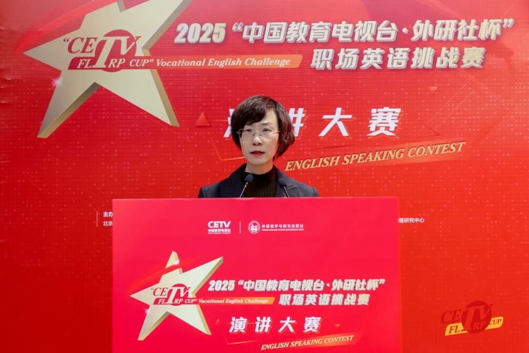 外语教学与研究出版社党委副书记、副总编辑常小玲在致辞中向决赛选手表示祝贺。常小玲指出,2025年是决胜“十四五”、谋划“十五五”的关键之年,中国式现代化持续深化,高质量发展成为鲜明的时代主题。“中国教育电视台·外研社杯”职场英语挑战赛响应时代要求,汇聚院校力量,打造具有示范性、引领力的语言类品牌赛事,在赛题设计上,通过“主题演讲”“青年之声”强化思政融入,引导学生用外语讲好中国故事;依托“职场方案”“职场共赢”聚焦真实岗位任务,全面提升职场沟通、跨文化协作与可持续发展能力。未来,外研社将继续以赛事为平台,以优质教材筑基,以数字技术赋能,以教师发展固本,以产教融合提质,以国际合作拓维,系统构建服务职业外语教育高质量发展的新生态。期待选手们以语言为媒、以专业为本,将青春理想融入强国伟业,成长为联通中国与世界的坚实桥梁。