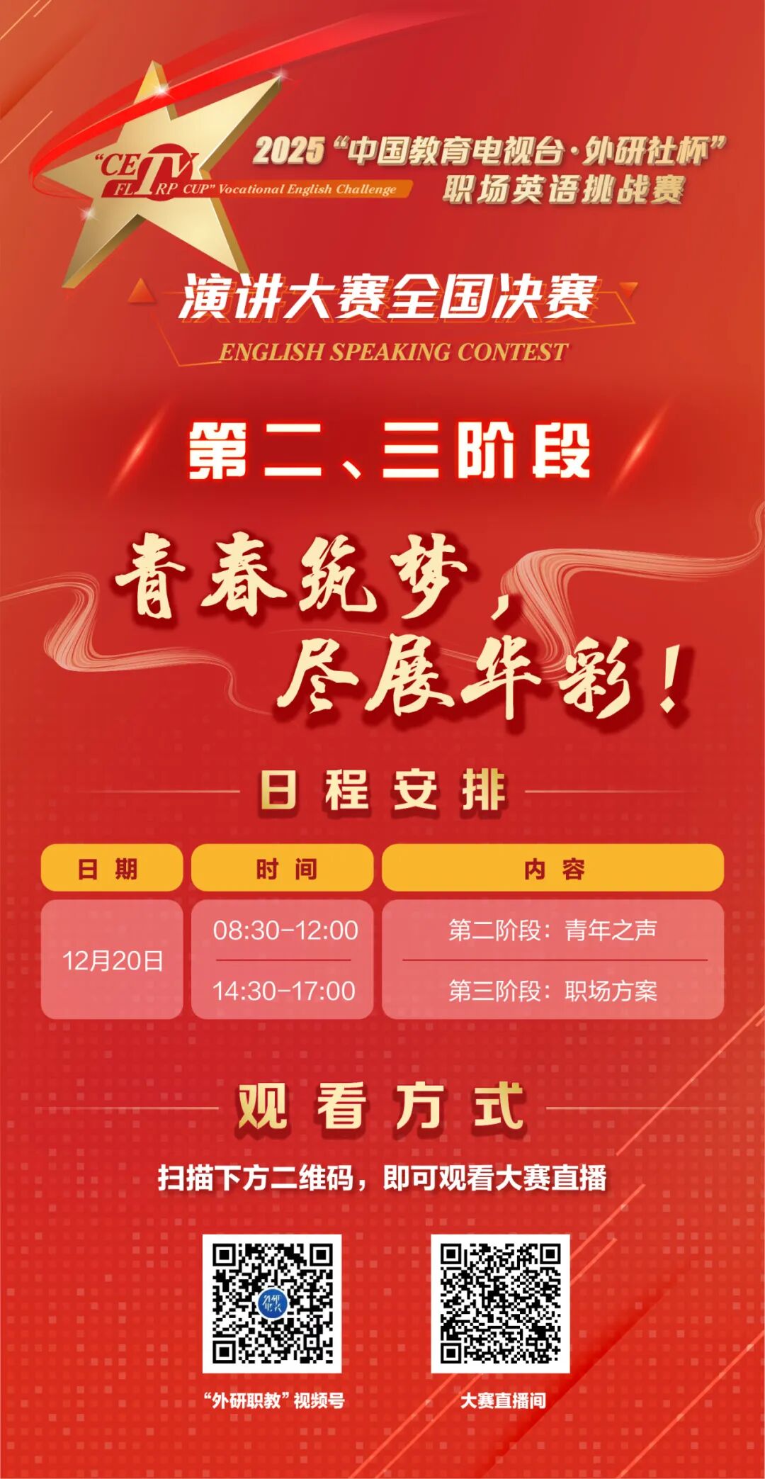 经过第一阶段的激烈角逐与评委的公正评判,共有32位选手成功晋级下一阶段。第二阶段“青年之声”将于12月20日上午8:30准时开赛,“外研职教”视频号全程直播。期待在后续阶段的舞台上,各位选手能够继续全力以赴、直面挑战、超越自我!